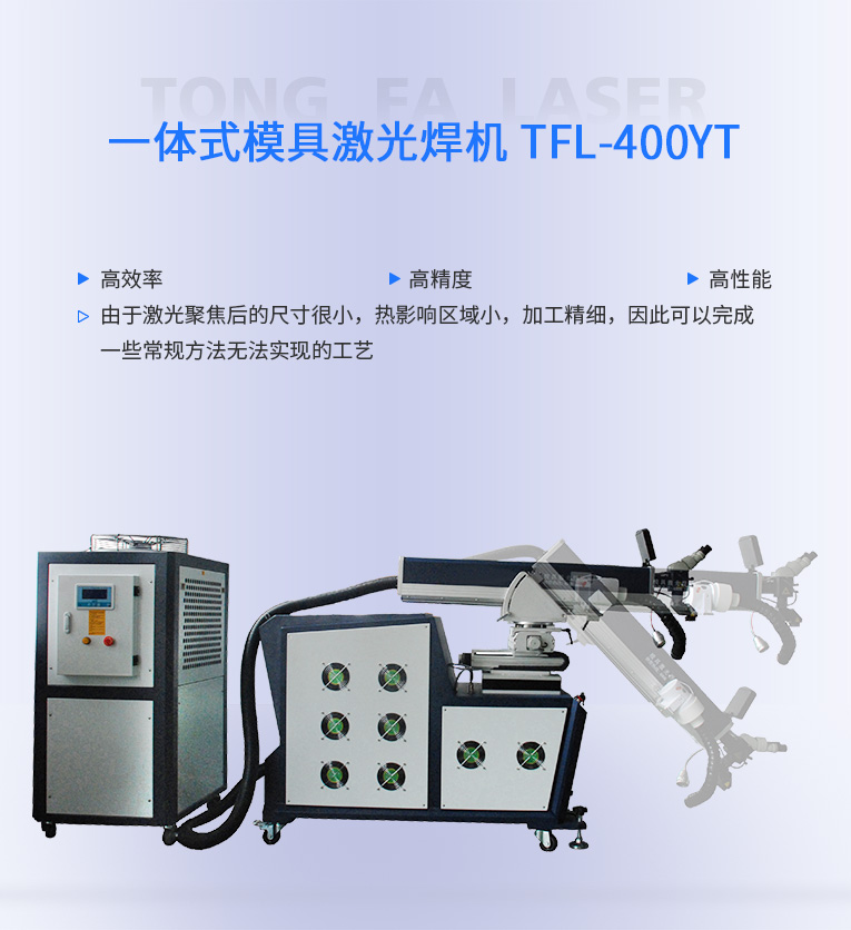 通發(fā)激光一體式模具激光焊機TFL-400YT是一款多種功能融合一體的新型模具激光焊接機,針對特大型塑料模具激光焊、中型注塑模具激光燒焊、小型塑膠模具激光補焊、壓鑄模激光補焊具等各類模具可實現(xiàn)超精密修復(fù),幫您解決大型汽車模具修復(fù)難題,不需要模具移動,電動工作臺與立體旋轉(zhuǎn)激光頭完美結(jié)合,操作桿控制運動移動實現(xiàn)輕松激光修復(fù)大型模具,同時也保留了傳統(tǒng)手動工作臺超精密修復(fù)模具功能。