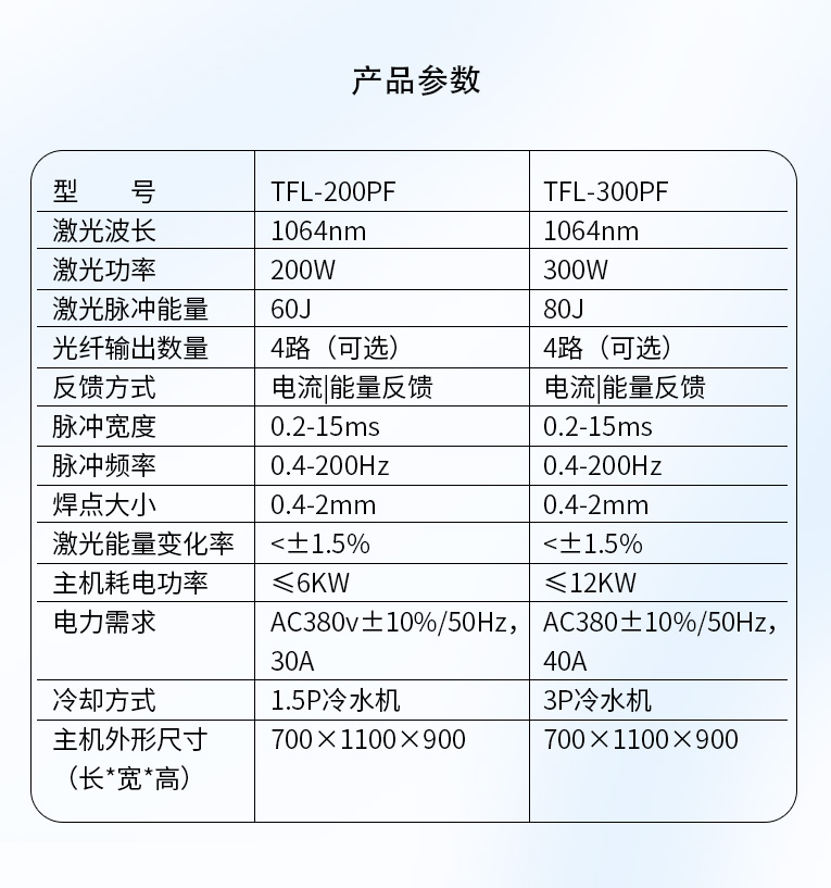 TFL-200PF/300PF光纖激光焊機(jī)是一款高穩(wěn)定性、中功率的光纖激光焊機(jī),滿足長時(shí)間生產(chǎn)的需要。大功率激光電源,大功率散熱系統(tǒng)滿足24小時(shí)大批量生立。機(jī)身采用高強(qiáng)度結(jié)構(gòu),保證精度、性能穩(wěn)定。焊接控制系統(tǒng)是專為激光焊接度身定做的專業(yè)4軸控制系統(tǒng),穩(wěn)定性高,易學(xué)易懂易上手。擴(kuò)展性強(qiáng),可結(jié)合流水線、光電傳感器、氣動(dòng)夾具等組合進(jìn)行全自動(dòng)無人值守式加工??蛇M(jìn)行時(shí)間分光或能量分光,適合不同加工的場合的應(yīng)用,多工位加工應(yīng)用,可以廣泛應(yīng)用在點(diǎn)焊、連續(xù)焊及柔性加工需求行業(yè)等激光焊接。